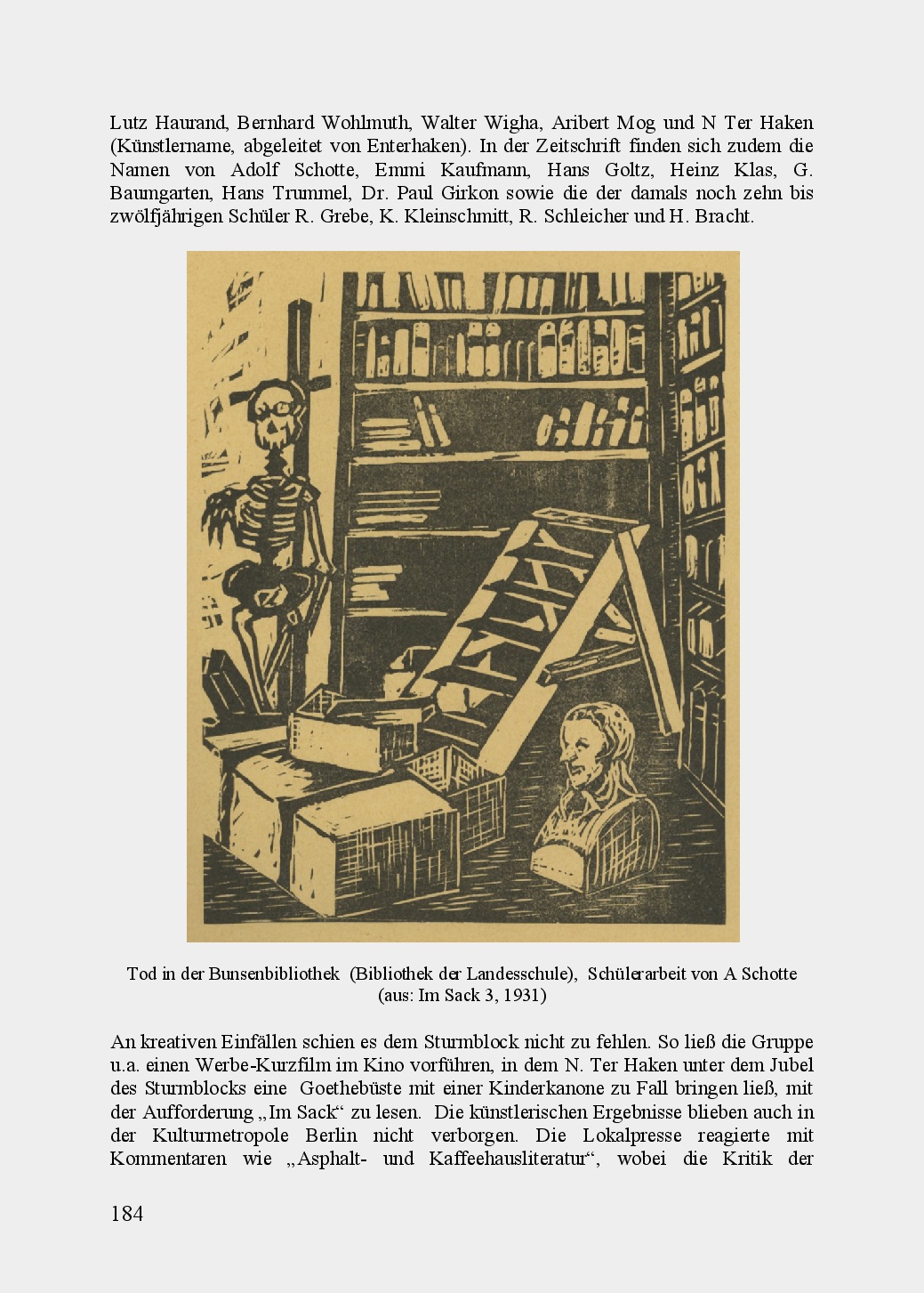 - Schreiben des Schuldirektors des Landesgymnasiums an den „Herrn Oberpräsidenten“ vom 1.06.1934 (Bestand: SchA ALS). Die Zwangsmitgliedschaft in der „Reichskammer der bildenden Künste“, für die der Ariernachweis Voraussetzung war, ermöglichte ebenso wie das Berufsbeamtengesetz (7.4.1933) die „Säuberung“ und Gleichschaltung des Kulturbereichs. Nichtmitglieder erhielten keine Arbeitsund Publikationserlaubnis.