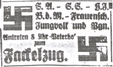 „Corbach, 1. Febr. [1933] Kundgebung. Am gestrigen Abend veranstaltete die NSDAP. und der Stahlhelm aus Anlaß der Bildung des Kabinetts Hitler [Machtübernahme] einen Fackelzug durch die Straßen der Stadt. Diese Veranstaltung gestaltete sich zu einer imposanten Kundgebung. Die Straßen, durch die die Kolonnen zogen, waren schon lange vorher dicht von Menschen umsäumt. Besonders am Berndorfertorplatz und bei Bracks Kump hatten sich zahlreiche Zuschauer eingefunden. Die einzelnen Abteilungen sammelten sich am Peterhof. Gegen ¾ 8 Uhr setzte sich der Zug unter den Marschklängen der Röderschen Kapelle in Bewegung. Drei Hakenkreuzbanner flatterten den Abteilungen voran. Weit über 200 uniformierte SS.- SA.- und HJ.-Mannschaften, eine Abteilung Stahlhelm und zahllreiche Parteigänger in Zivil beteiligten sich an dem Fackelzug.“